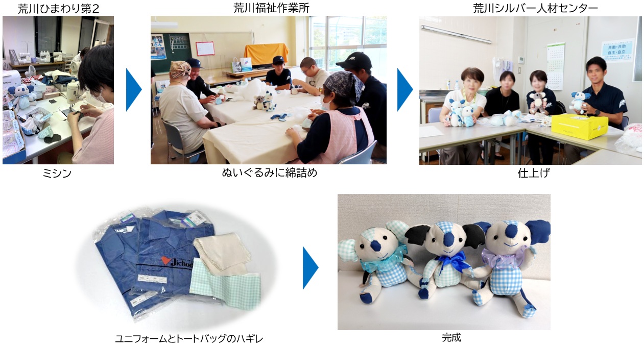 当社もリニューアルに伴い処分予定だった新品のユニフォームや、工場見学で子どもたちに贈呈したトートバッグのハギレを活用し、荒川ひまわり第2福祉作業所様、荒川福祉作業所様、荒川シルバー人材センター様の地域3団体の皆様と協力して参加しました。当日は荒川区長によるスピーチもあり、セレモニーの様子は荒川区のHPにも掲載されています。